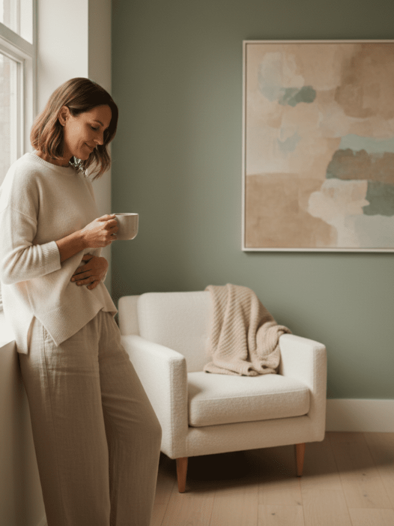 A soft, modern wellness scene featuring a calm, confident woman in her late 30s–40s standing near a bright window, natural light on her face. She appears thoughtful and grounded, holding a cup of tea or resting her hand gently over her chest, conveying balance and steadiness rather than stress. Subtle visual cues of health and science in the background — minimal greenery, a notebook or lab-style paper on a table, clean neutral tones (warm beige, soft sage, light gray). The overall mood is calm, supportive, and intelligent — blending hormone health, immune balance, and clinical credibility without looking medical or sterile.